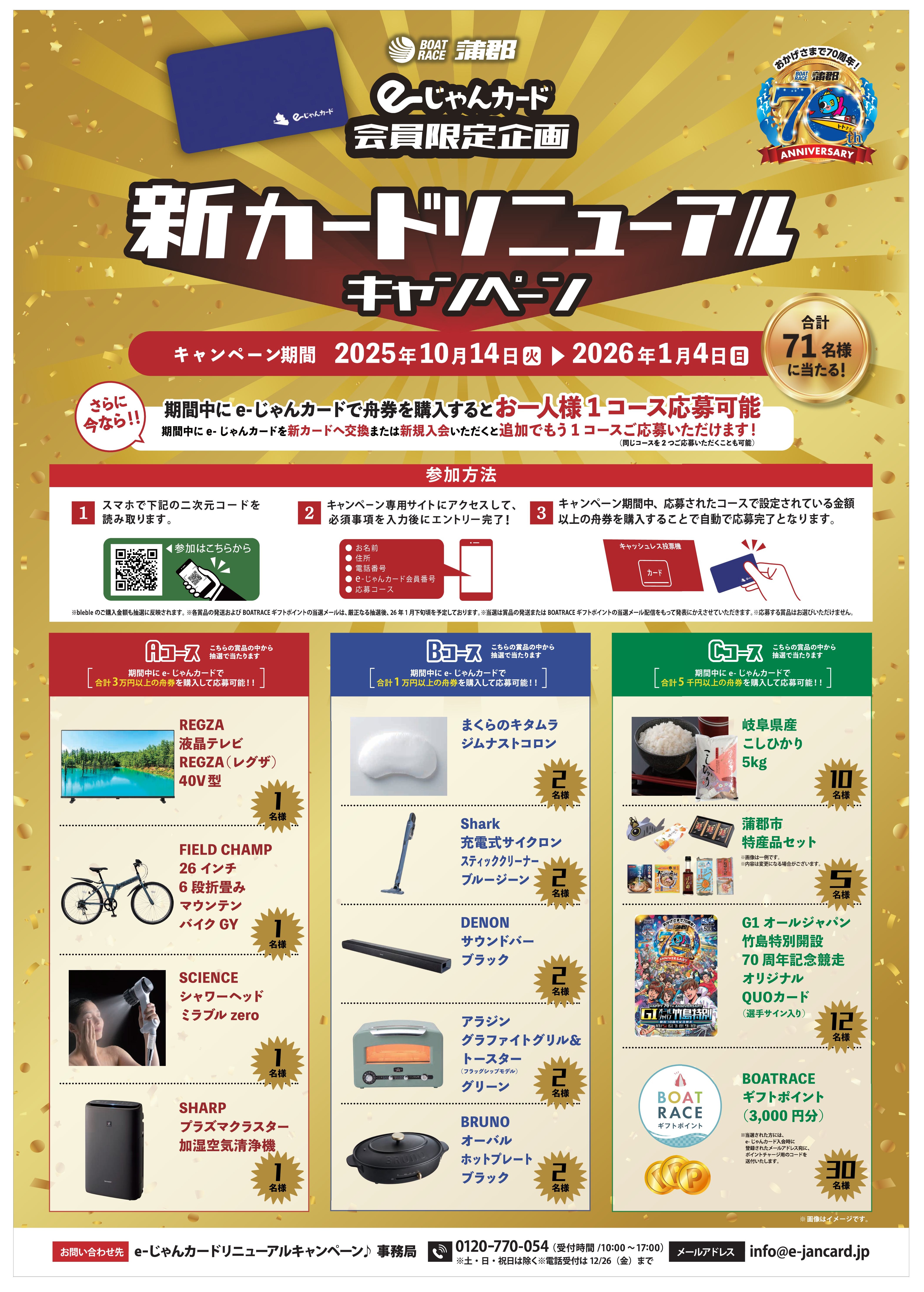 e-じゃんカードで舟券を購入いただいた方に抽選で賞品が当たるキャンペーンを実施中です。