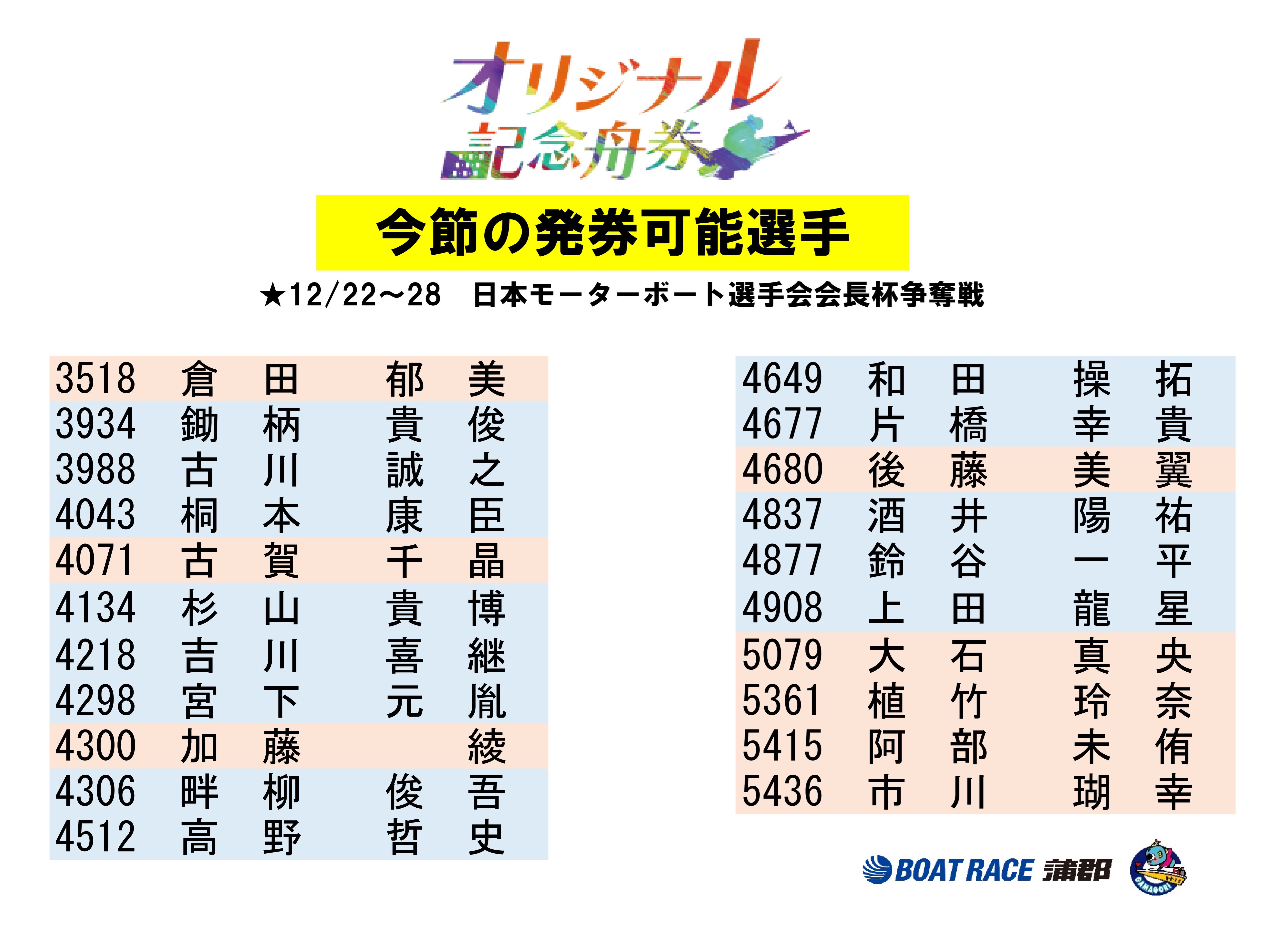 (1)今節のオリジナル記念舟券対象選手を予めご確認ください。発行機付近またはイベント&ファンサービスページに掲載予定です。