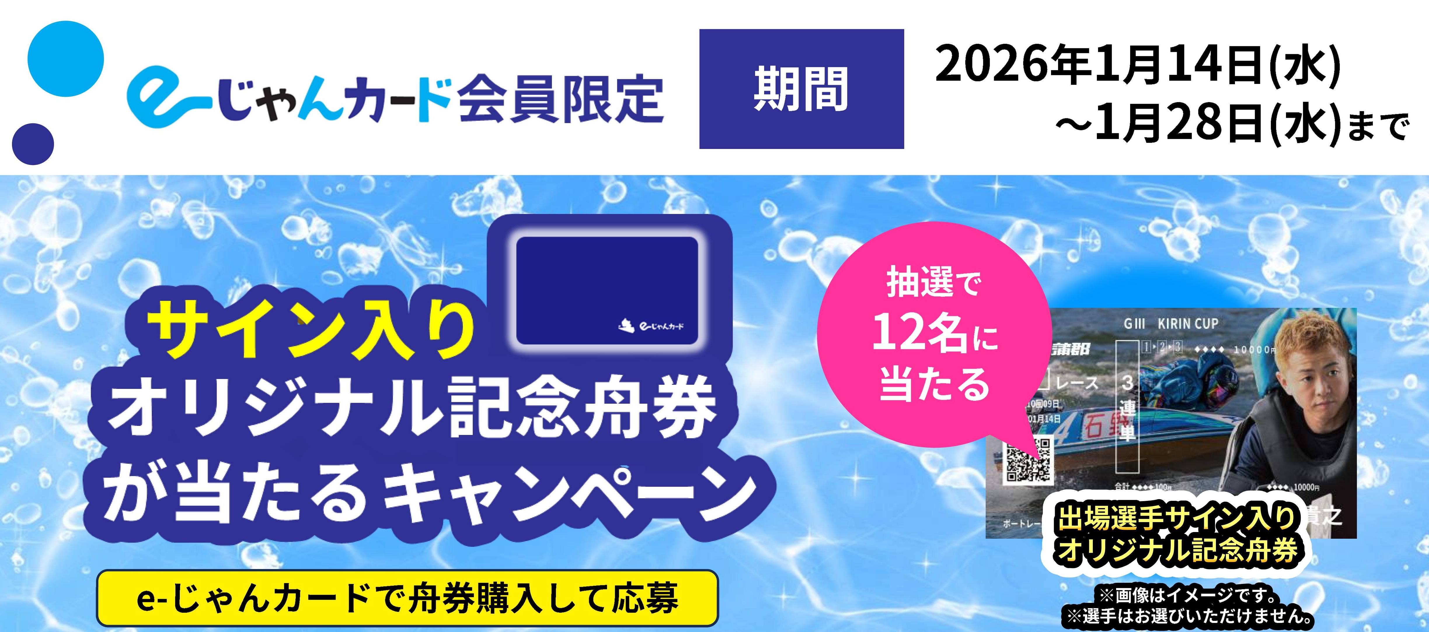 専用ブースにある応募用紙に必要事項を記入の上、下記レース期間中にe―じゃんカードで100円以上の舟券を購入すると、当該レース出場選手のサイン入りオリジナル記念舟券が抽選で12名様に当たります!